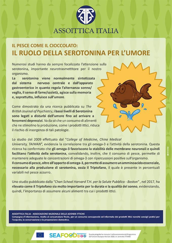 Il consumo di pesce, oltre all’apporto dei omega-3, permette di assumere un amminoacido essenziale, necessario alla produzione di serotonina, ossia il Triptofano, il quale è presente in percentuali variabili nel pesce azzurro.