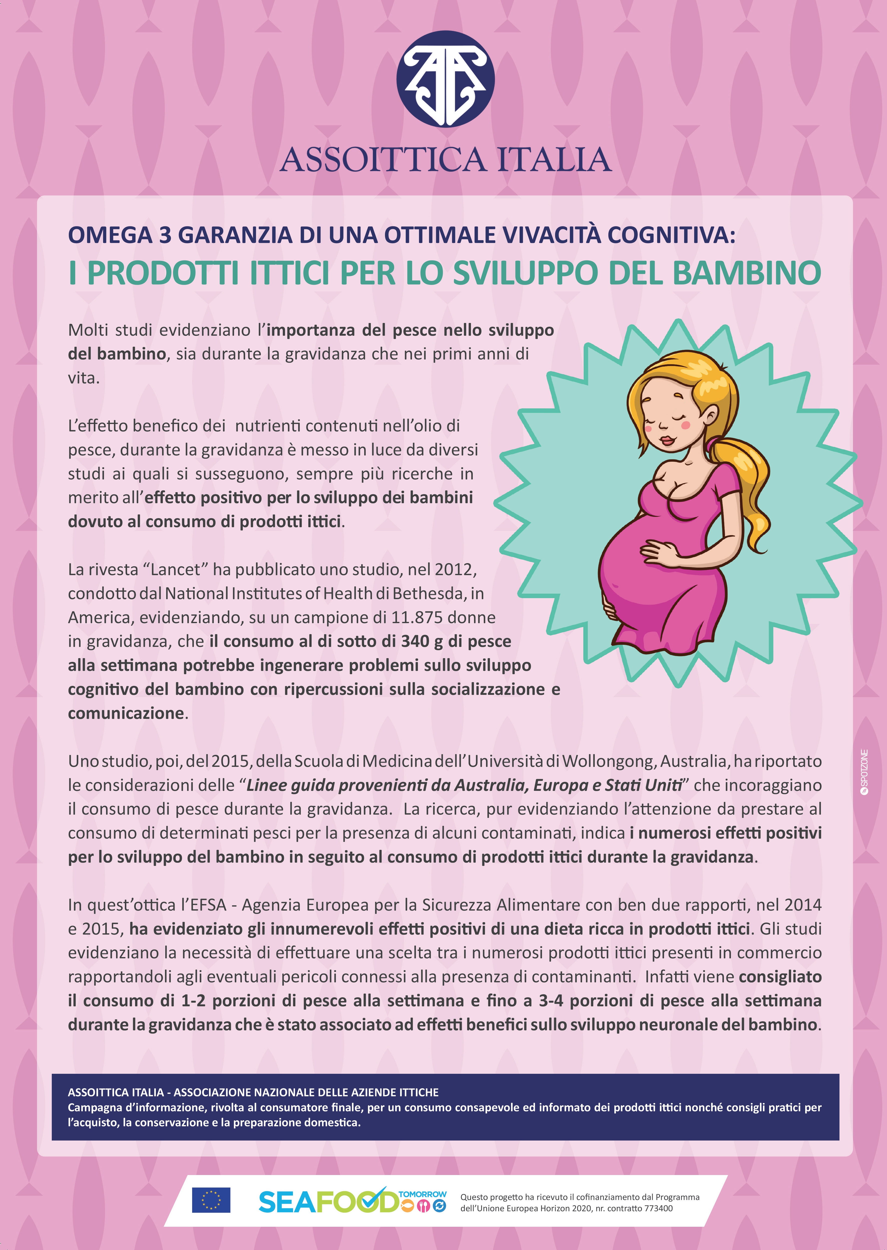 In quest’ottica l’EFSA – Agenzia Europea per la Sicurezza Alimentare con ben due rapporti, nel 2014 e 2015, ha evidenziato gli innumerevoli effetti positivi di una dieta ricca in prodotti ittici. Gli studi evidenziano la necessità di effettuare una scelta tra i numerosi prodotti ittici presenti in commercio rapportandoli agli eventuali pericoli connessi alla presenza di contaminanti. Infatti viene consigliato il consumo di 1-2 porzioni di pesce alla settimana e fino a 3-4 porzioni di pesce alla settimana durante la gravidanza che è stato associato ad effetti benefici sullo sviluppo neuronale del bambino.
