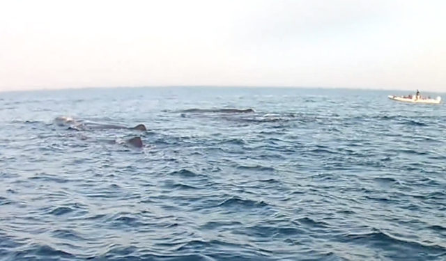 Si tratta di un branco di cinque capodogli adulti, mammiferi marini odontoceti di circa 18 metri ciascuno che, grazie a condizioni oceanografiche particolari instauratesi nel golfo di Catania negli ultimi giorni, si sono riuniti in prossimità della costa. Ad aggiunta del già particolare evento, un branco di un centinaio di stenelle striate (la specie di delfino più comune nel Golfo, così come in tutto il Mediterraneo) a giocare coi loro amici giganti del mare.